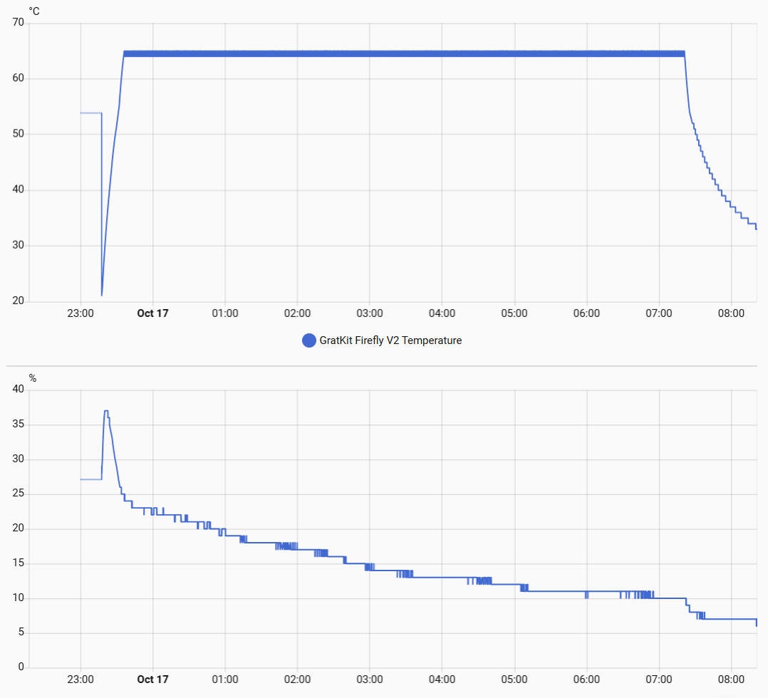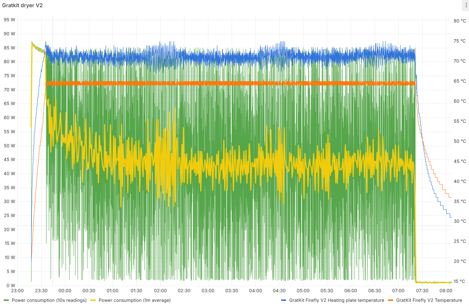 The heater element probably was indeed rated at about 50 W in the first revision, which was therefore unable to reach the nominal 70 °C temperature. In the second revision they must have updated the heater element, without updating the power supply. I wonder how the power consumption would look like if I connected a 24 V power supply actually rated at 96 W (4 A).